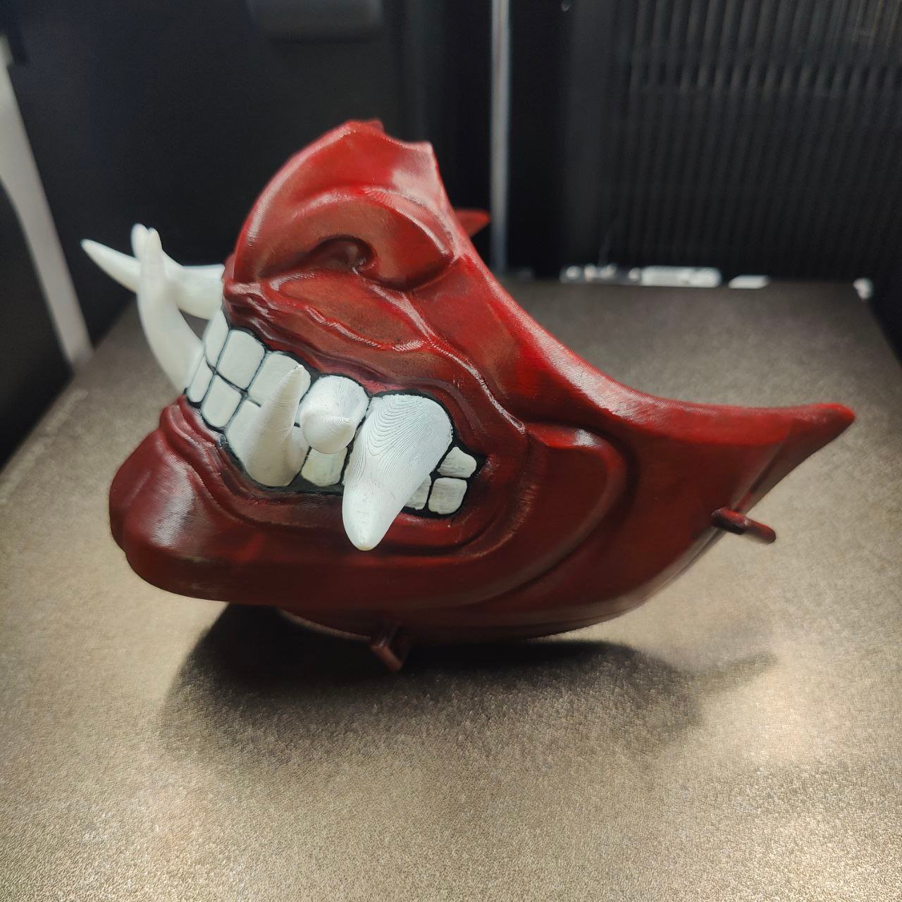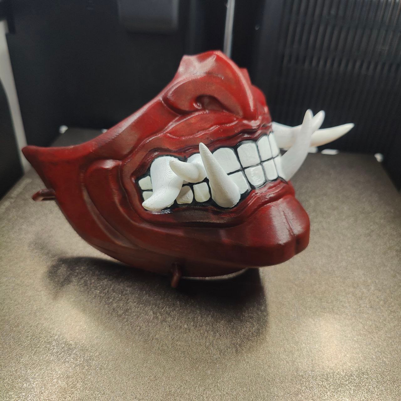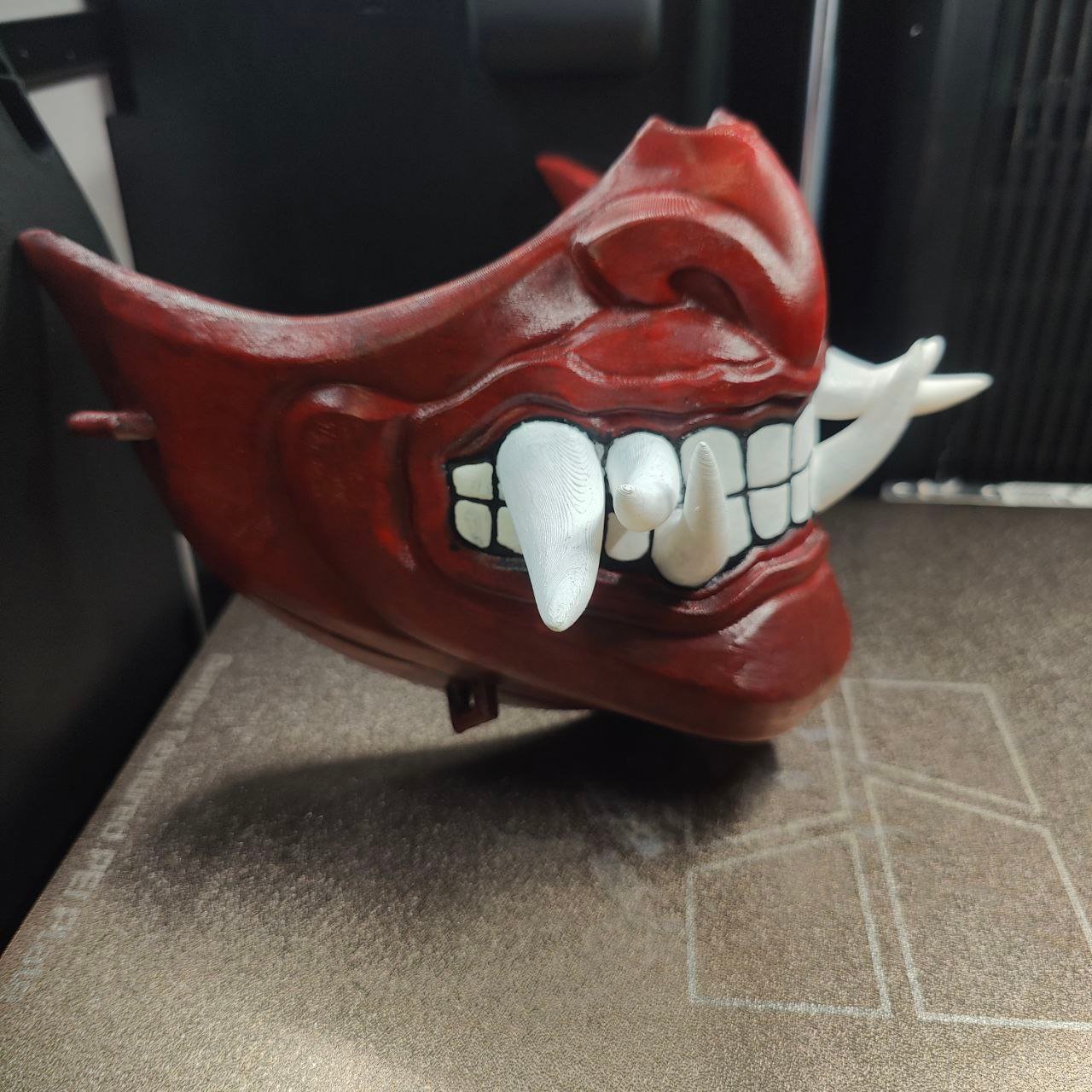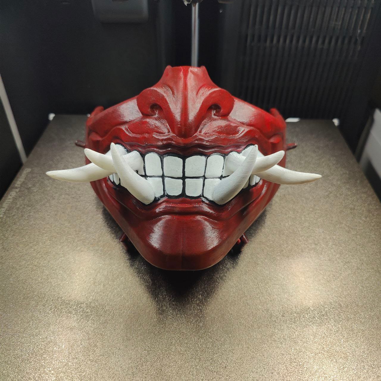 Unleash your inner warrior with this striking Samurai Oni Mask, inspired by traditional Japanese folklore. Expertly 3D printed and hand-finished, this mask features a fierce red demon face with detailed textures, sharp teeth, and imposing tusks — symbolizing strength, courage, and protection.